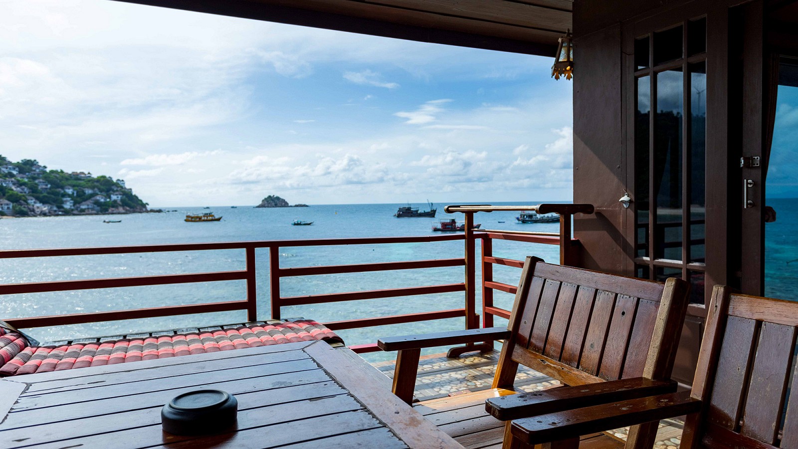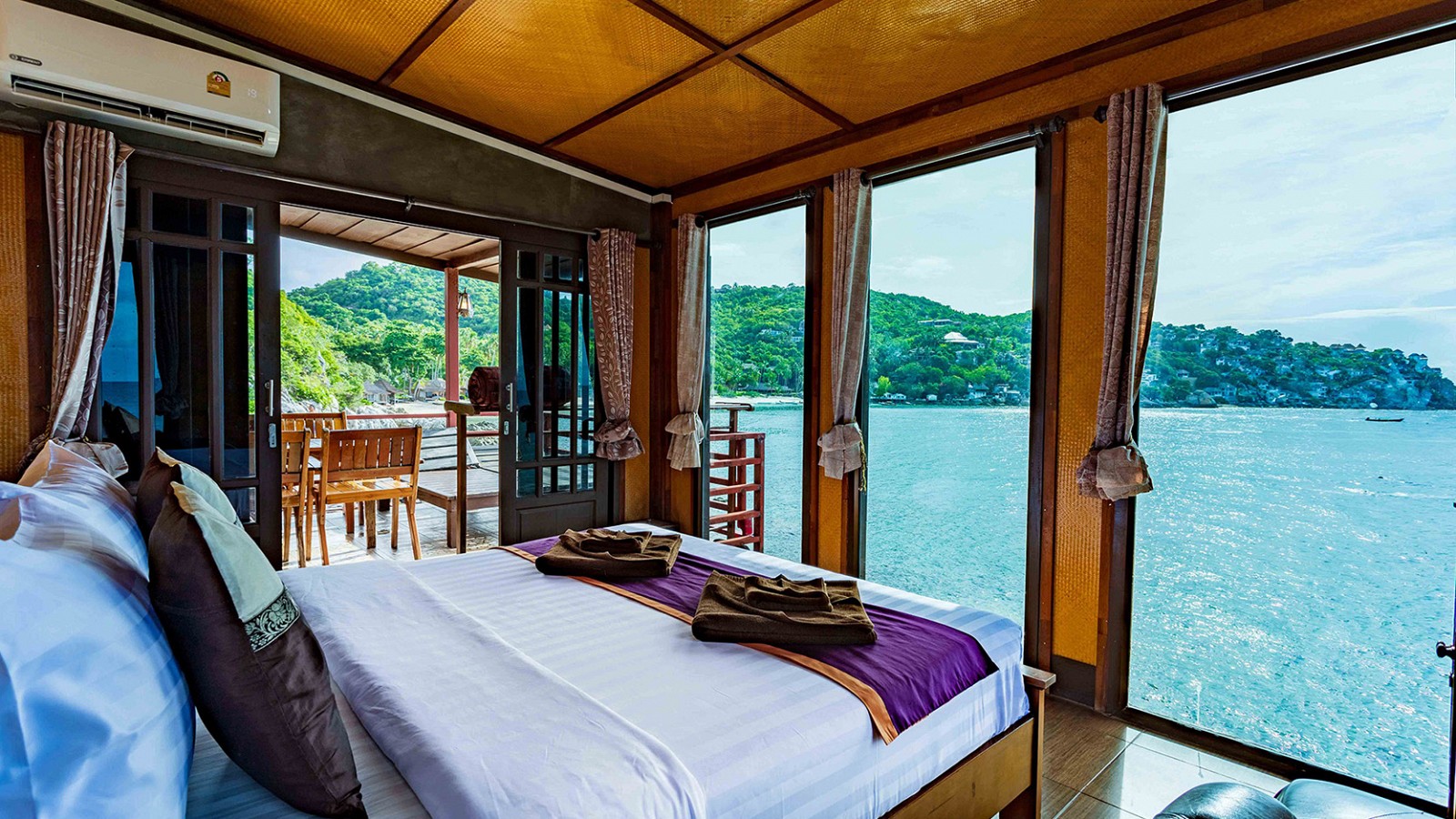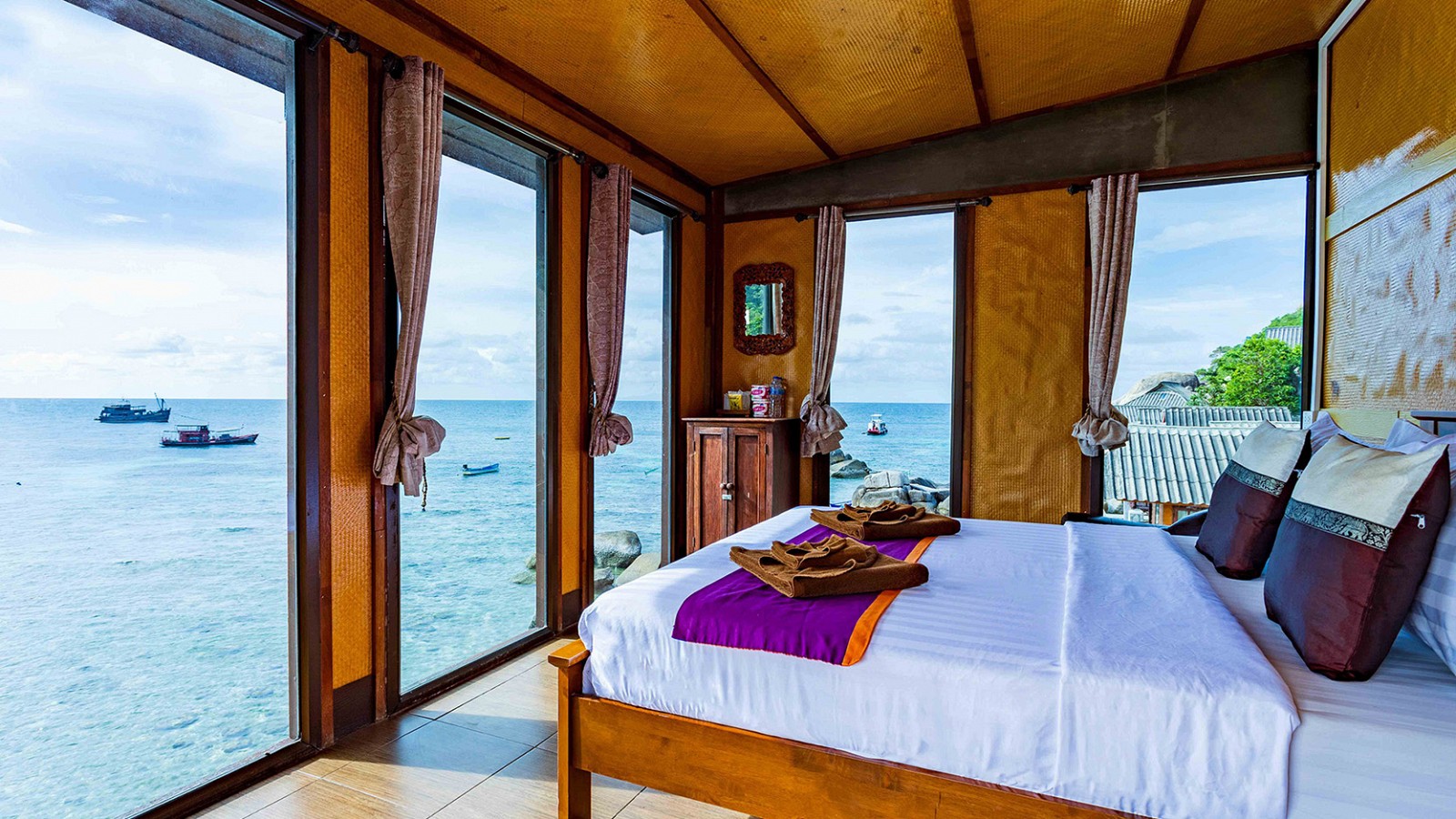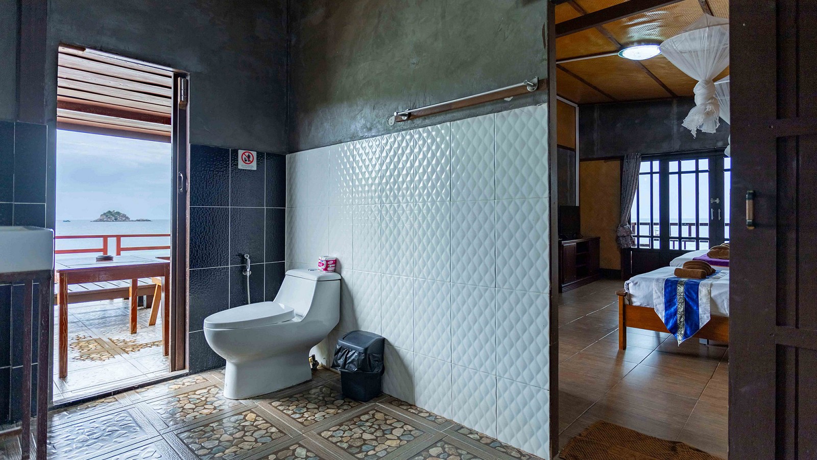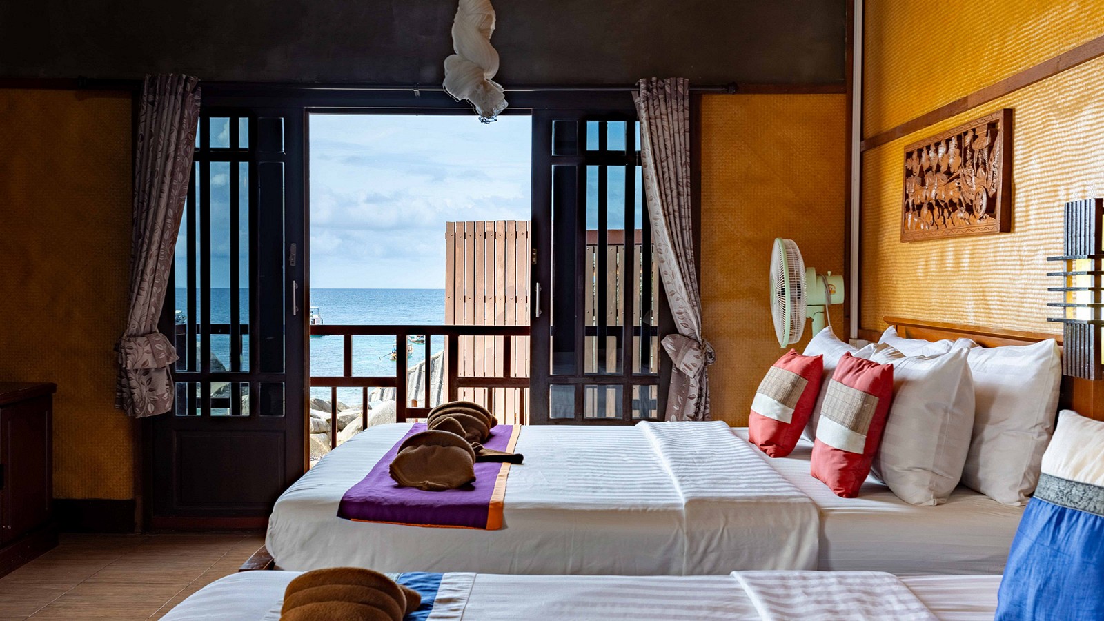 The front bedroom features clear glass windows offering a stunning panoramic sea view. A large private balcony provides the perfect space for family activities—whether relaxing, lounging, or enjoying the sea breeze.